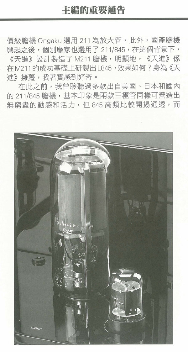 设计与制造BEWITCH L845的《天进》并非新进厂家,以广州为基地的《天进》近年在胆机发烧友之间早已建立稳固的口碑与声誉,厂方先后以SN 3008牛前级和M211单声道胆机攻占市场,我试听过之后,肯定它们是当今HIGH END高端国产胆机之中最杰出的其中两件产品,事实上,以价论声,BEWITCH SN 3008T/M211此一胆机组合物超所值的程度是我们这一代在欧美贵价高级胆机之中成长的发烧友难以想象者,而正因为SN3008T/M211的声音表现和制作水准是如此出众,当时感觉上我认为《天进》在胆机制作方面已不容易有什么突破,然而,在M211面世两年多之后,《天进》宣布推出L845单声道胆机,外壳和线路与M211相似,但放大管改用845,资深胆机发烧友就知道,作为20世纪30年代面世的中型三极放大管,211与845在声音特性上各有优点,而在喜爱真空管的朋友之间亦各有 拥趸,211与845具是高压俱是放大管(屏压超过1000V),对线路和零件(特别是变压器)有特别严格的要求,不少胆机厂家基于商业考虑都不想用这两款放大管,但据我个人聆听所得,当设计正确时,211与845营造音乐境界之高是一般五极放大管难以企及者,历史上名气最双的211/845胆机皆是由美国《西电》WESTERN ELECTRIC制造,《西当》43采用211,而《西电》87采用845,不过,43与87两者皆为功率增强器Booster,见证《西电》设计上确认211和845两款三极放大管能够在维持幼细音色之余增强力道,达至[有气势、又幼细]的传真之道,一直以来,211/845甚少厂家采用,大部分211/845胆机都是DIY自作派发烧友的制品,但过去二十年211/845有翻身现象,英国胆机厂家AUDIO NOTE赖以成名的天价级胆机Ongaku选用211为放大管,此外,国产胆机兴起之后,个别厂家也选用了211/845,在这个背景下,《天进》设计制造出M211胆机,明显也,天进是在211的成功基础上研制出L845,效果如何?身为《天进》拥趸,我着实感到好奇。