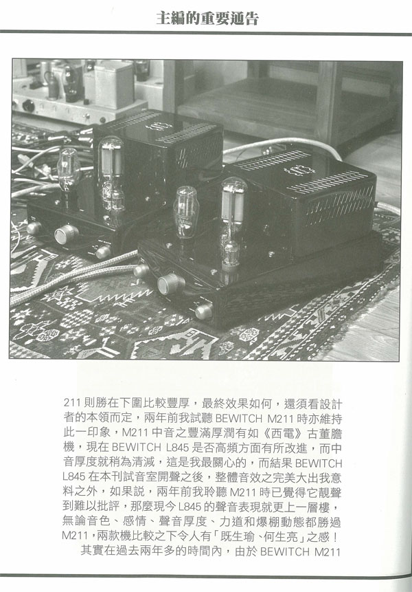 毫无疑问,BEWITCH L845系我近年来听过出自中国大陆最优秀的三极管胆机,它音色之美与声音魅力之强大令我一听倾情,确定此机体现三极名管845的优点与特性已达致历来最高水平,另一方面,具有如此声音质素的胆机以现今的价钱发售,我又怎能不赞叹我国的胆机制造业发展成熟,产品《声价比》之高称霸世界。