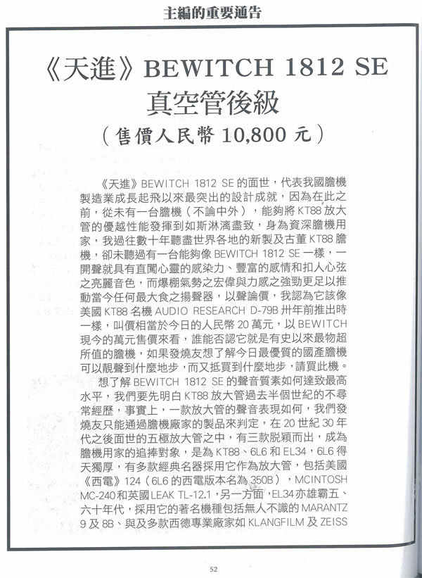 《天进》Bewitch  1812 SE的面世,代表我国胆机制造业成长起飞以来最突出的设计成就,因为在此之前,从未有一台胆机(不论中外),能够将KT88放大管的优越性能发挥到如斯淋漓尽致,身为资深胆机用家,我过往数十年听听世界各地的新制及古董KT88胆机,卻未听过有一台能够像Bewitch 1812 SE一样,一开声就具有直闯心灵的感染力、丰富的感情和扣人心弦之亮丽音色,而爆棚气势之宏伟与力感之强劲更足以推动当今任何最大食之扬声器,以声论价,我认为它该像美国KT88名机AUDIO RESEARCH  D-79B三年前推出时一样,叫价相当于今日的人民币20万元,以Bewitch 现今的万元售价来看,谁能否认它就是有史以来最物超所值的胆机,如果发烧友想了解今日最优质的国产胆机可以靓声到什么地步,而又抵买到什么地步,请买此机。