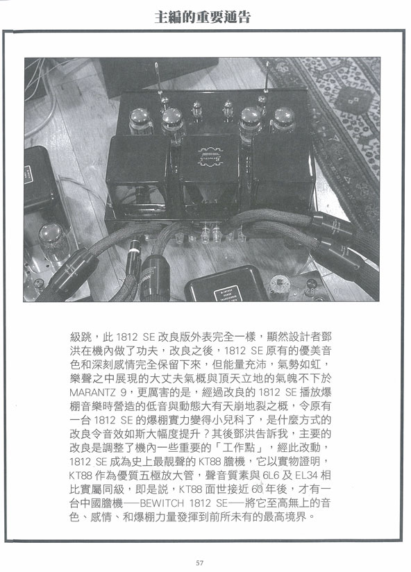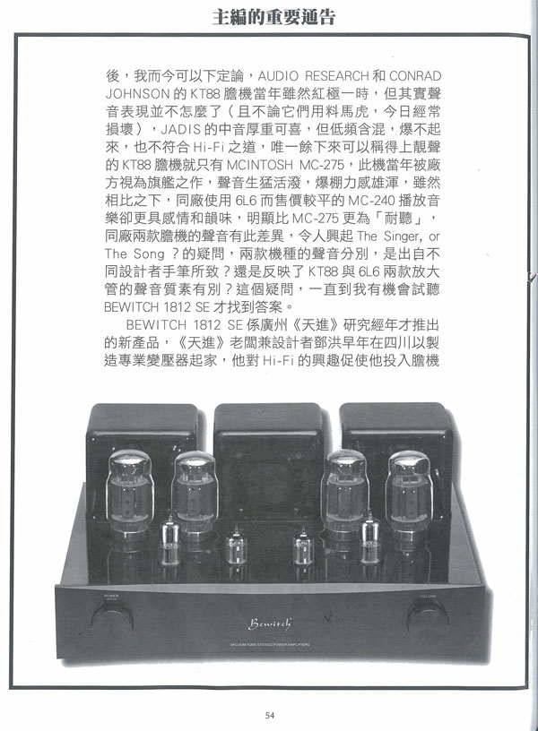 想了解Bewitch  1812 SE的声音质素如何达致最高水平,我们要先明白KT88放大管过去半个世纪的不寻常经历,事实上, 一款放大管的声音表现如何,我们发烧友只能通过胆机厂家制品来判定,在20世纪30年代之后面世的五机放大管之中,有三款脱颖而出,成为胆机用家的追捧对象,是为KT88、6L6和EL34,6L6得天独厚,有多款经典名器采用它作为放大管,包括美国《西电》124(6L6西电版本名为350B),MCINTOSH  MC-240和英国LEAK  TL-12.1,另一方面,EL34亦雄霸五、六十年代,采用它的著名机种包括无人不识的MARANTZ9及8B、与及多款西德专业厂家如KLANGFILM及ZEISS等制造的推挽胆机,相比之下,KT88自五十年代中期面世之后就较少厂家采用,KT88输出较大,规格上潜质之优厚亦颇为明显,但在60年代之前,较为人称道的KT88胆机就只有一台MCINTOSH  MC-275,踏入七十年代之后,KT88开始受胆机厂家重视,美国两大胆机厂家AUDIO RESEARCH和CONRAD  JOHNSON都有推出多款KT88胆机,而法国JADIS稍后亦CKT88胆机打入市场, 本人的发烧阅历始于七十年代,所以上述三间厂家的KT88胆机代表作都全部听过、用过和拥有过(部份仍然拥有),比较之下,三间厂家的产品各有特色,但纯粹以声音表现来说,却明显是MCINTOSH-275排名首位,我不止一次说过,时间是考验音响器材的最佳试金石,随著时光流逝,发烧友总有机会在不同场合听到新旧不同时代的胆机即场比试,自然就会得出大家认同的结论,以KT88胆机来说,我在家中与本刊试间室之中经常有数款不同厂家产品开声比较,过尽千帆之后,我而今可以下定论,AUDIO RESEARCH和CONRAD JOHNSON的KT88胆机当年虽然红极一时,但其实声音表现并不怎么了(且不论它们用料马虎,今日经常损坏),JADIS的中音厚重可喜,但低频含混,爆不起来,也不符合HI-FI之道,唯一余下来可以称得上靓声的KT88胆机就只有MCINTOSHMC-275,此机当年被厂方视为旗舰之作,声音生猛活泼,爆棚力感雄浑,虽然相比之下,同厂使用6L6而售价较平的MC-240播放音乐却更具感情和韵味,明显比MC-275更为(耐听),同厂两款胆机的声音有此差异,令人兴起The Singer,Or The Song?的疑问,两款机种的声音分别,是出自不同设计者手笔所致?还是反映了KT88与6L6两款放大管的声音质素有别?这个疑问,一直到我有机会试听Bewitch 1812 SE才找到答案。