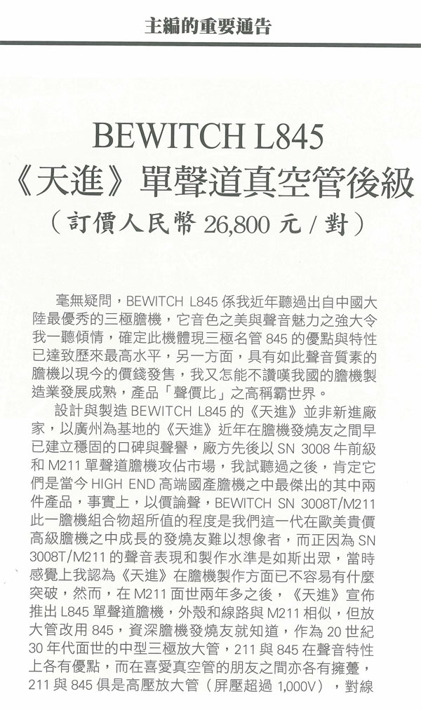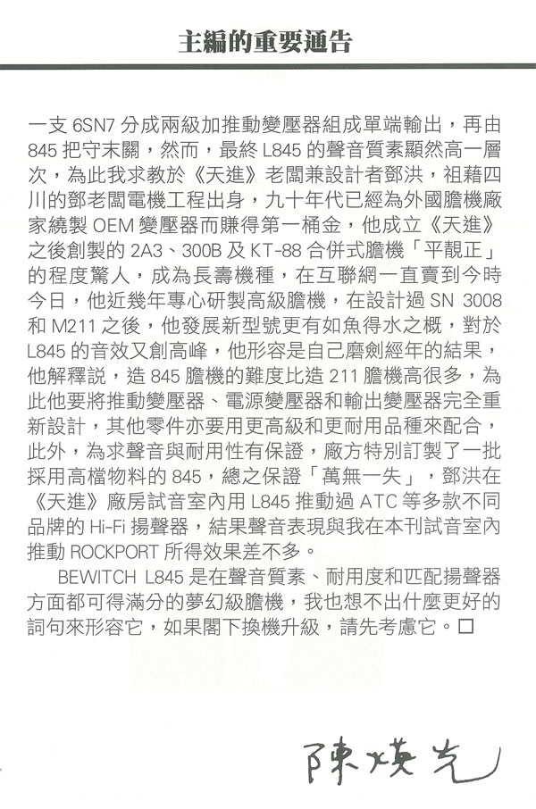 BEWITCH L845是在声音质素、耐用度和匹配扬声器方面都可得满分的梦幻级胆机,我也想不出什么更好的词句来形容它,如果阁下换机升级,请先考虑它。