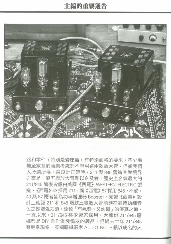 设计与制造BEWITCH L845的《天进》并非新进厂家,以广州为基地的《天进》近年在胆机发烧友之间早已建立稳固的口碑与声誉,厂方先后以SN 3008牛前级和M211单声道胆机攻占市场,我试听过之后,肯定它们是当今HIGH END高端国产胆机之中最杰出的其中两件产品,事实上,以价论声,BEWITCH SN 3008T/M211此一胆机组合物超所值的程度是我们这一代在欧美贵价高级胆机之中成长的发烧友难以想象者,而正因为SN3008T/M211的声音表现和制作水准是如此出众,当时感觉上我认为《天进》在胆机制作方面已不容易有什么突破,然而,在M211面世两年多之后,《天进》宣布推出L845单声道胆机,外壳和线路与M211相似,但放大管改用845,资深胆机发烧友就知道,作为20世纪30年代面世的中型三极放大管,211与845在声音特性上各有优点,而在喜爱真空管的朋友之间亦各有 拥趸,211与845具是高压俱是放大管(屏压超过1000V),对线路和零件(特别是变压器)有特别严格的要求,不少胆机厂家基于商业考虑都不想用这两款放大管,但据我个人聆听所得,当设计正确时,211与845营造音乐境界之高是一般五极放大管难以企及者,历史上名气最双的211/845胆机皆是由美国《西电》WESTERN ELECTRIC制造,《西当》43采用211,而《西电》87采用845,不过,43与87两者皆为功率增强器Booster,见证《西电》设计上确认211和845两款三极放大管能够在维持幼细音色之余增强力道,达至[有气势、又幼细]的传真之道,一直以来,211/845甚少厂家采用,大部分211/845胆机都是DIY自作派发烧友的制品,但过去二十年211/845有翻身现象,英国胆机厂家AUDIO NOTE赖以成名的天价级胆机Ongaku选用211为放大管,此外,国产胆机兴起之后,个别厂家也选用了211/845,在这个背景下,《天进》设计制造出M211胆机,明显也,天进是在211的成功基础上研制出L845,效果如何?身为《天进》拥趸,我着实感到好奇。