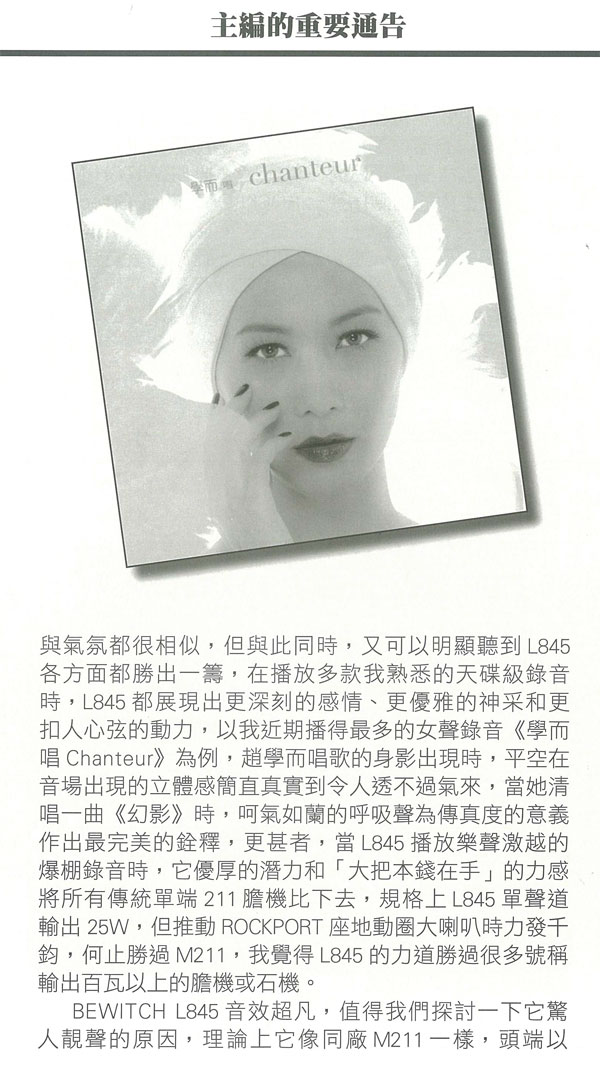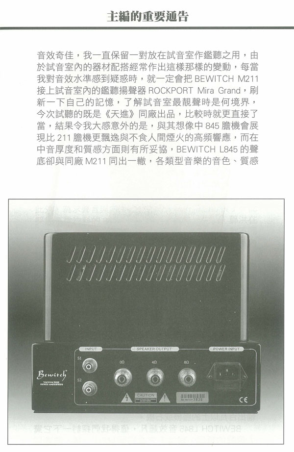 毫无疑问,BEWITCH L845系我近年来听过出自中国大陆最优秀的三极管胆机,它音色之美与声音魅力之强大令我一听倾情,确定此机体现三极名管845的优点与特性已达致历来最高水平,另一方面,具有如此声音质素的胆机以现今的价钱发售,我又怎能不赞叹我国的胆机制造业发展成熟,产品《声价比》之高称霸世界。